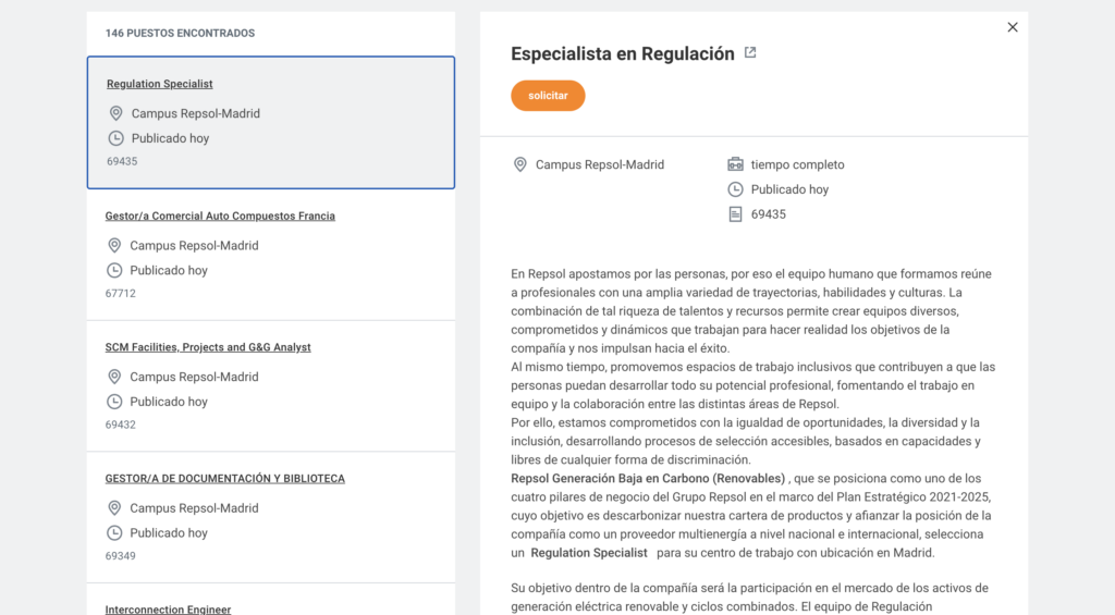 En esta ventana, aparecerán todas las ofertas de empleo existentes en la actualidad que ha publicado Repsol.