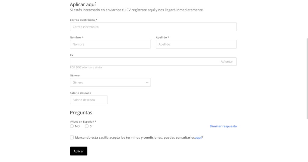 Tras completar el formulario de solicitud, se te solicitará que adjuntes tu CV y carta de presentación en formato digital.